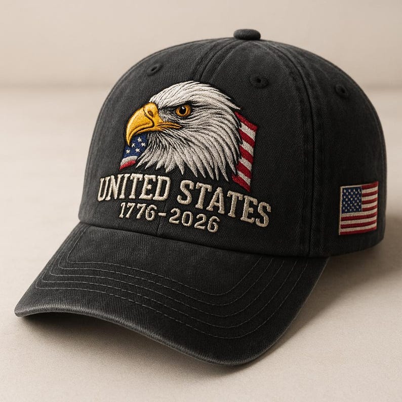 United States 1776 2026 Eagle Head Embroidered Hat American Flag Side Cap Patriotic Washed Black Gift