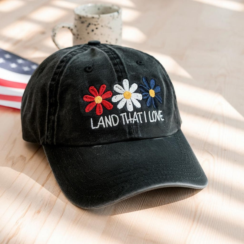 Land That I Love Hat Embroidered Red White Blue Flower Baseball Cap Patriotic Usa Independence Day Adjustable Vintage Denim Dad Hat